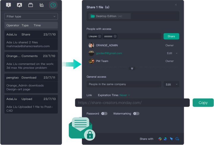 – External Security: Safeguard shared files with watermarking and password protection to prevent unauthorized access.