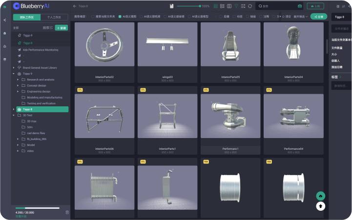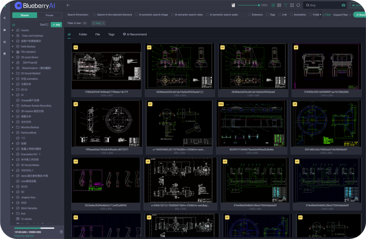 Blueberry AI revolutionizes file discovery with advanced search capabilities. Using AI-driven natural language and semantic search, it offers multi-modal search options, including image-to-image and image-to-video searches. The fuzzy search feature enables content-based semantic search, meaning files can be found even without tags. The platform’s AI recommendation algorithms know what files you’re looking for, often before you do, dramatically reducing time spent searching for assets.