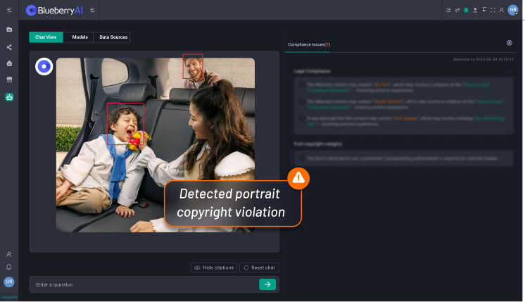 Blueberry AI handles intellectual property inspections, including font, image, trademark, and portrait licensing. It checks file properties like dimensions, size, and video length, while ensuring image quality and content consistency. Blueberry AI verifies that advertising slogans, imagery, and messaging remain consistent across all media, protecting both brand integrity and legal compliance.